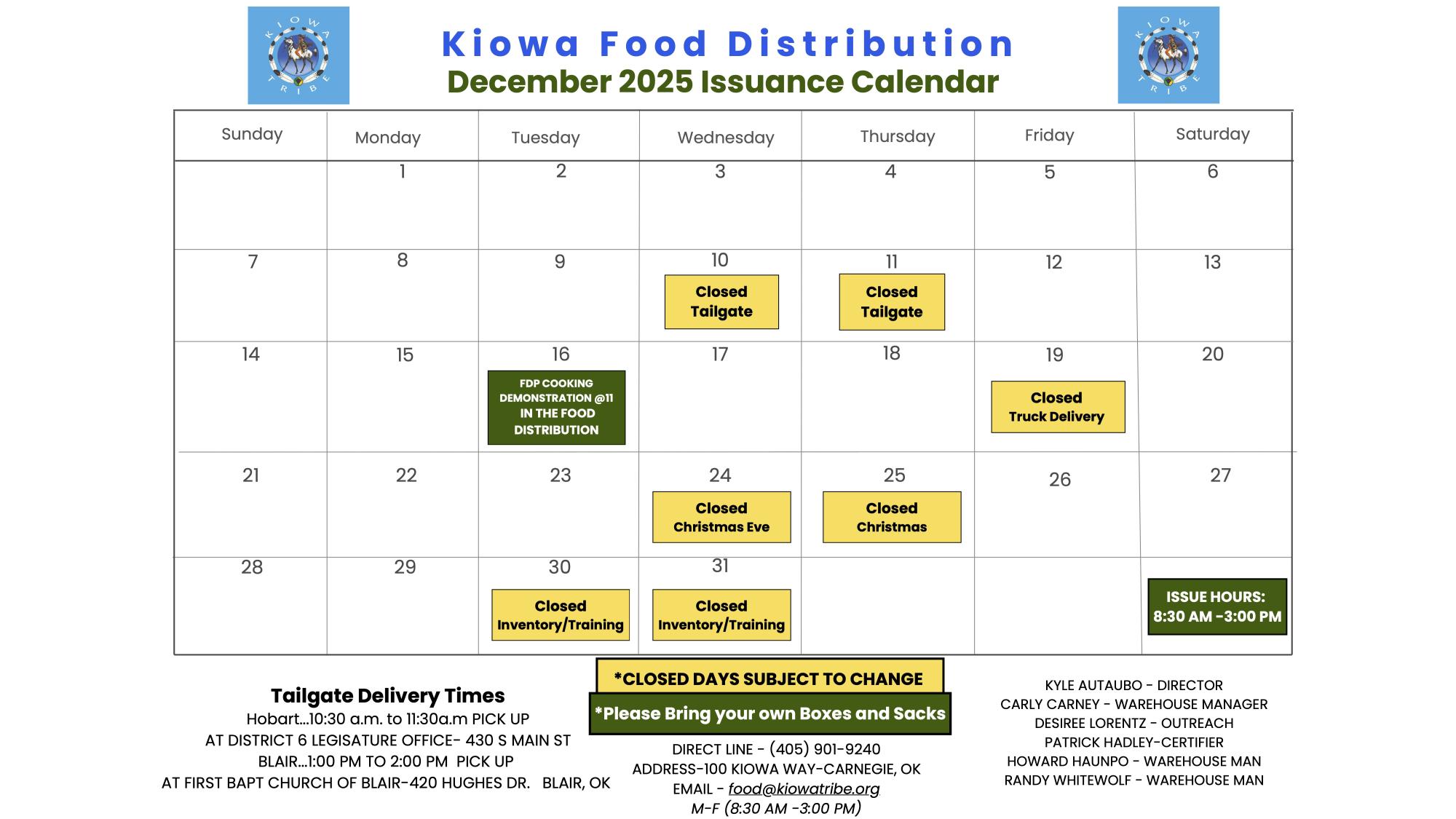 - The Food Distribution will be closed the first working day of the month for inventory.