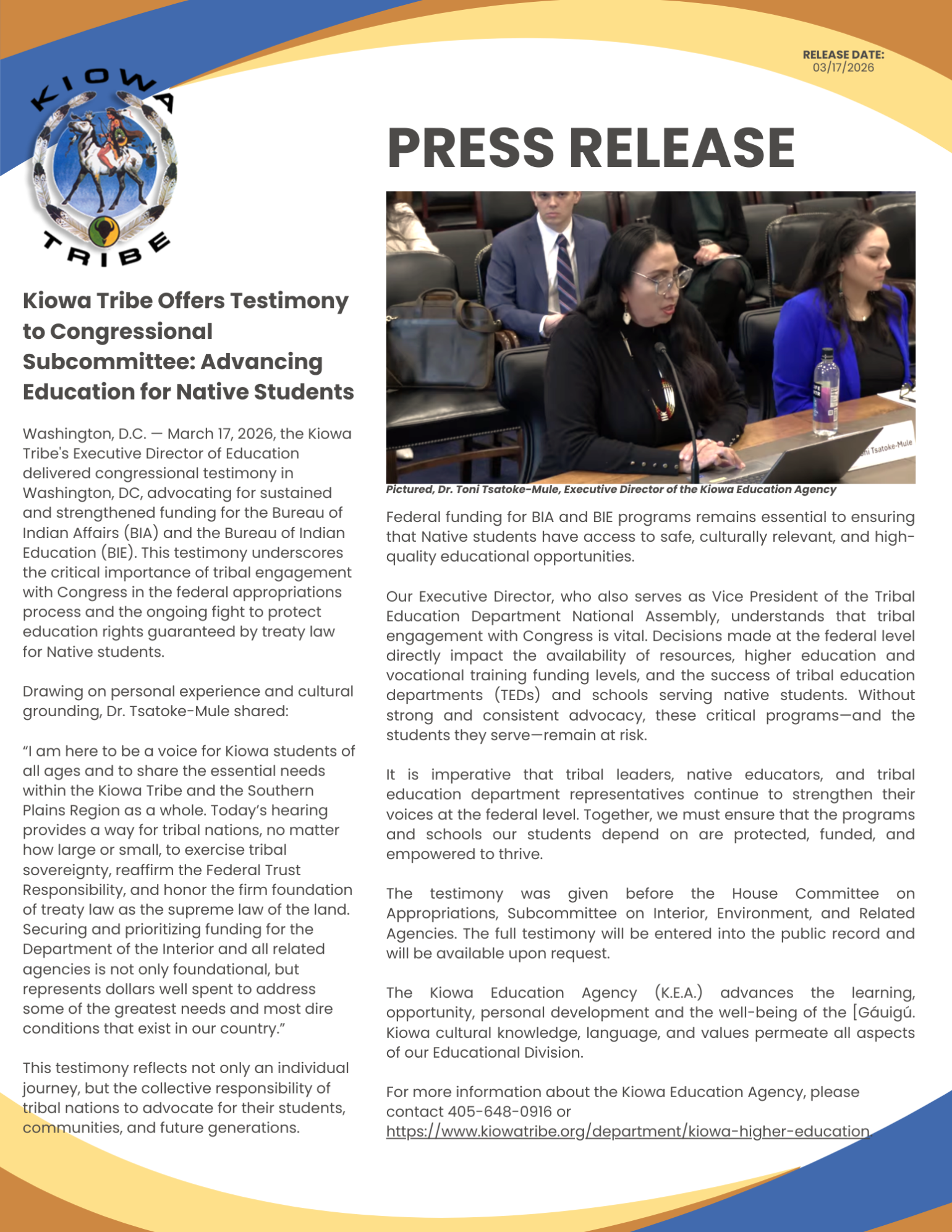 Kiowa Tribe Offers Testimony to Congressional Subcommittee: Advancing Education for Native Students